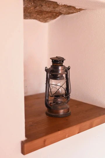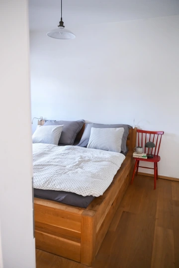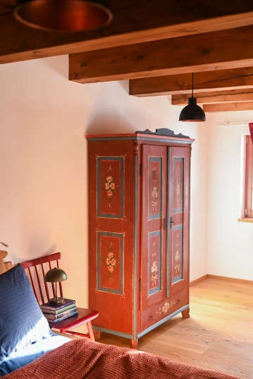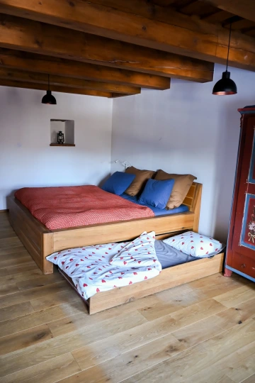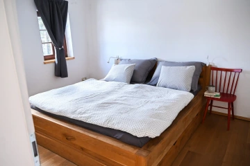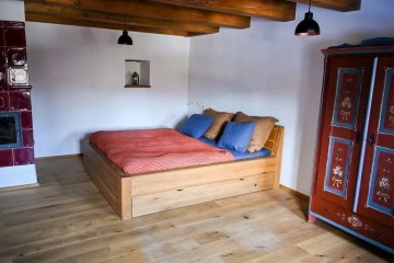 Velkorysá ložnice, které dominuje restaurovaná selská skříň a přiznané stropní trámy. Díky své prostornosti nabízí místo nejen pro spánek, ale i pro soukromou relaxaci v křesle s knihou nebo ranní protažení. Součástí je i decentní pracovní kout, který poslouží v momentě, kdy potřebujete na chvíli vyřídit neodkladné záležitosti v soukromí, stranou od společného dění.